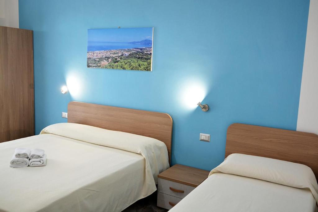 Con una superficie di circa 20 m², la camera è arredata con semplicità e dispone di un letto matrimoniale e un letto singolo. Gli spazi climatizzati e curati offrono un’atmosfera rilassante.